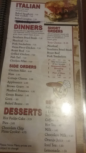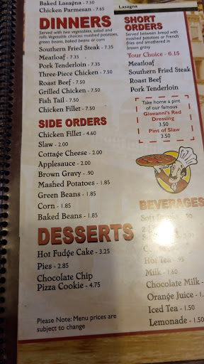 For mains, Giovanni’s delivers with local favorites like Southern Fried Steak Sandwich and Fish Tail, while Short Orders and Dinners offer real-deal comfort like Meatloaf, Roast Beef, and the much-loved Three-Piece Chicken Dinner. Each plate feels homemade — simple, nostalgic, and satisfying.